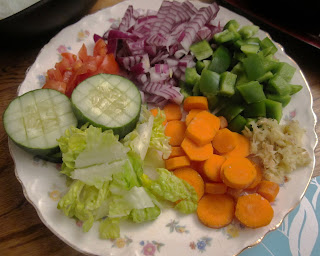 - A number of desired food ingredients (see below), diced and cut up into small bits; Obviously you can make a number of different combinations, and you could add a number of other ingredients or leave some out, but below is a list of things we almost always include in our rice paper wrap "buffet".